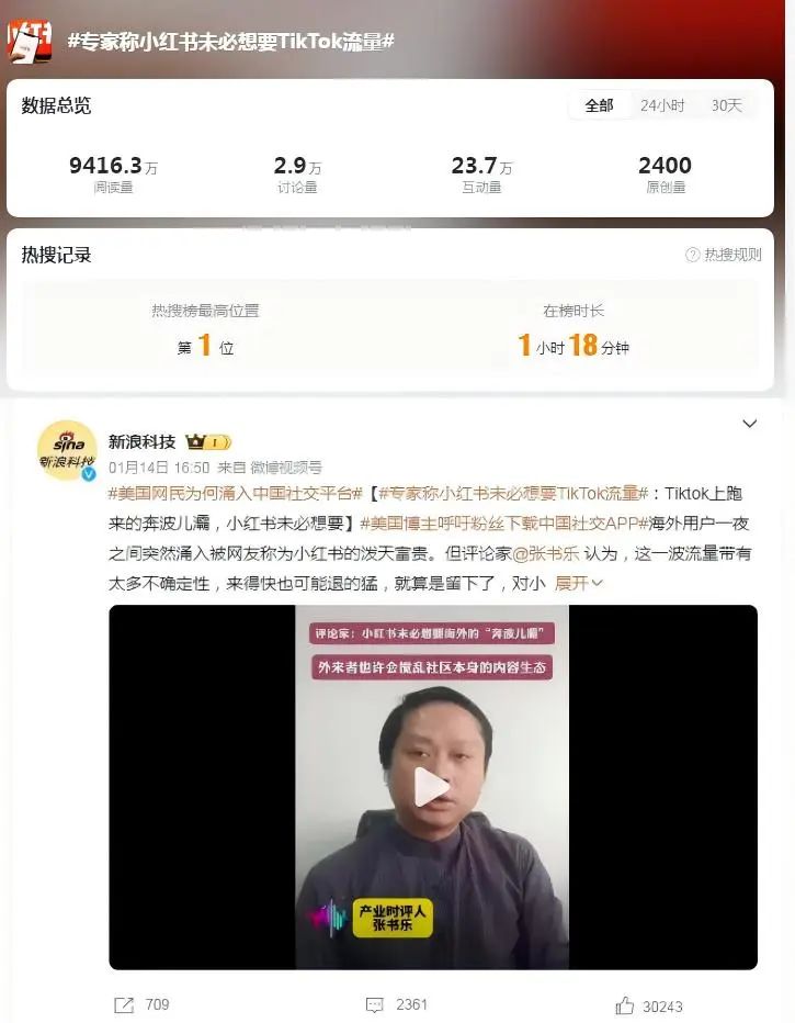 今年1月,我关于“美国网民涌入小红书”1分钟短视频,以微博以#专家称小红书未必想要TikTok流量#为话题,登上热搜榜第一名,1小时阅读量9416万。
